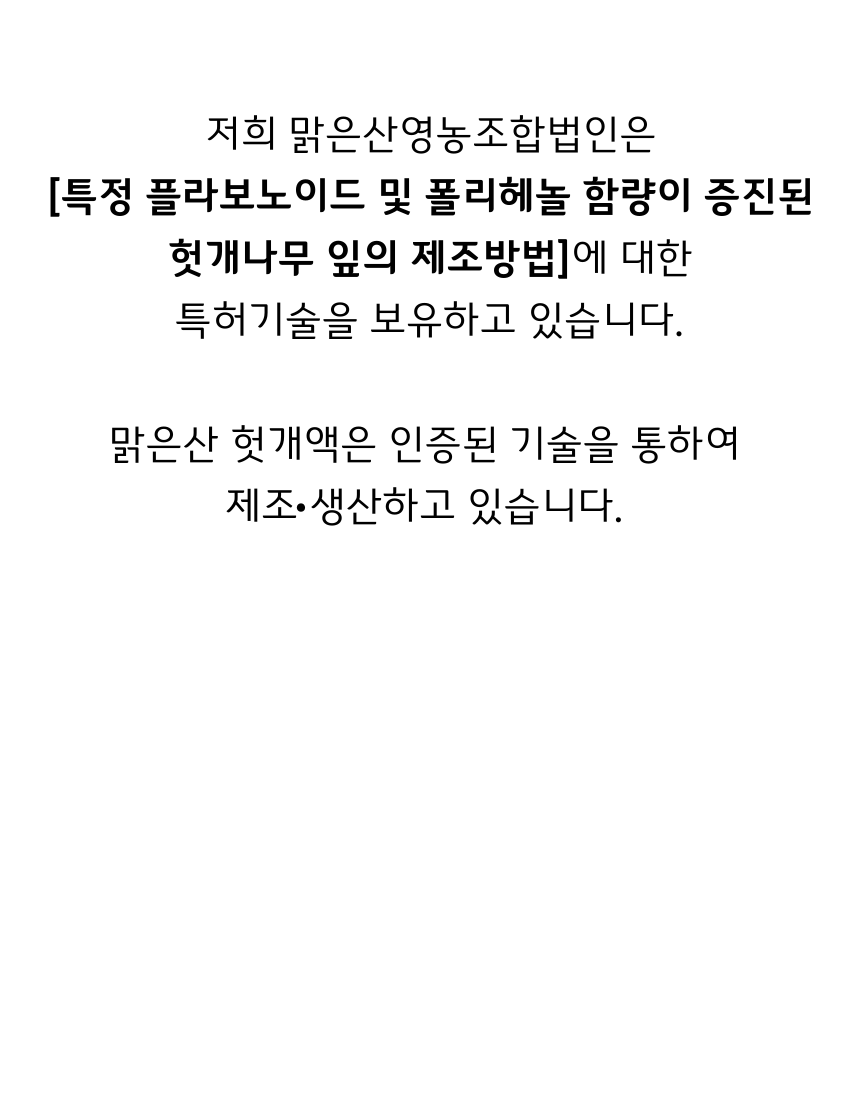 맑은산의 특허 제조법을 통해 항산화 성분 함량이 더욱 증진된 특제 [푸르뫼헛개액]입니다.
