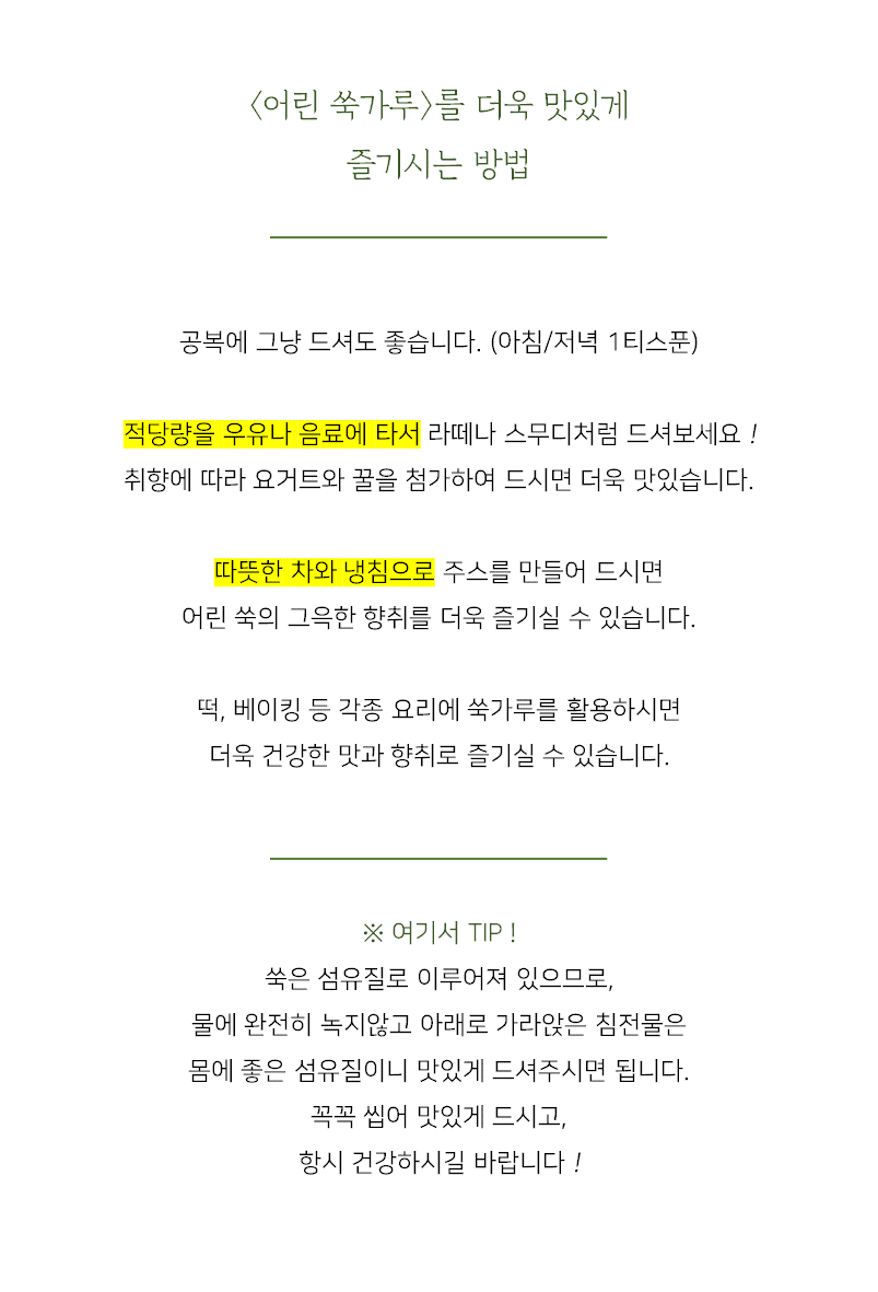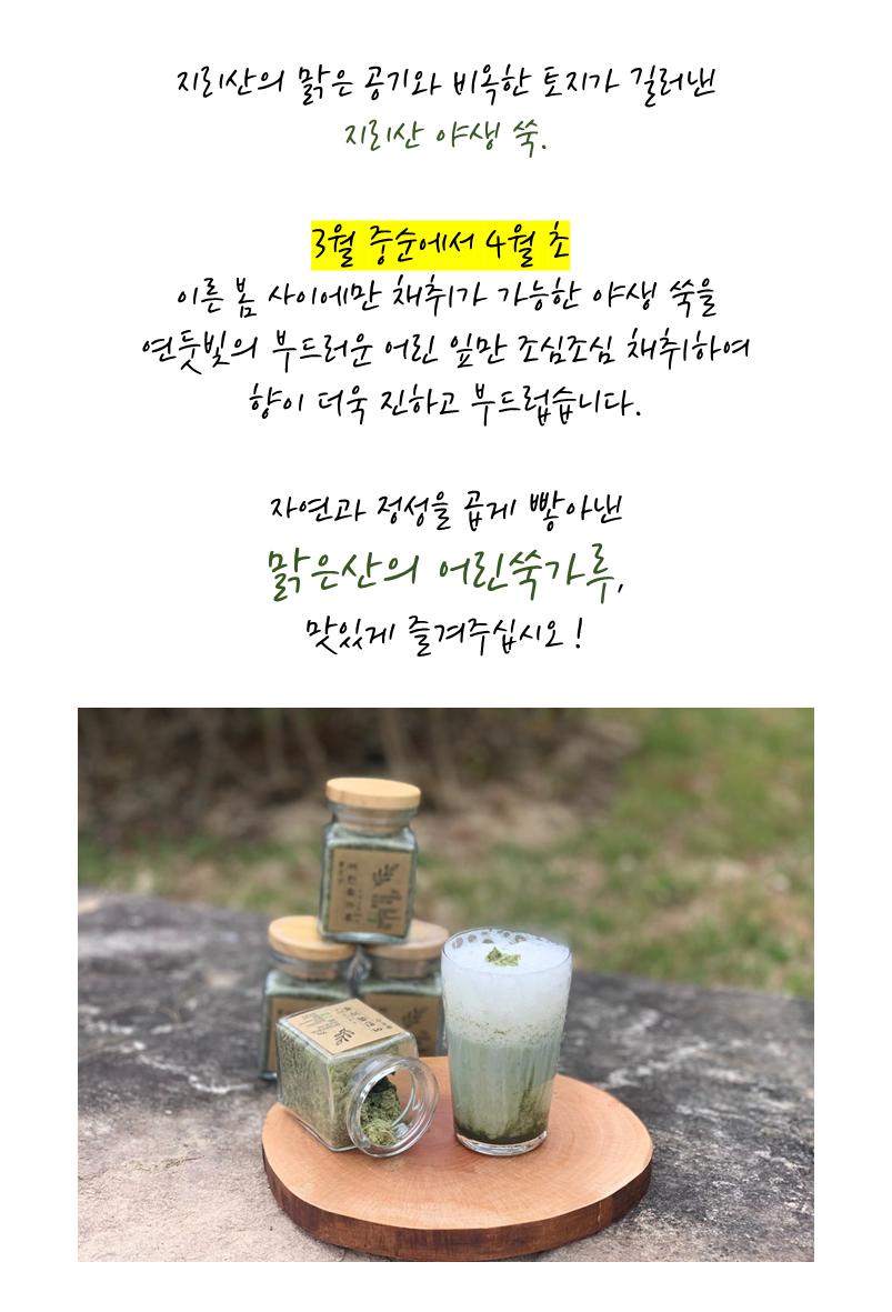 자연과 정성을 곱게 빻아낸 맑은산의 어린 쑥가루. 맛있게 즐겨 주십시오 !